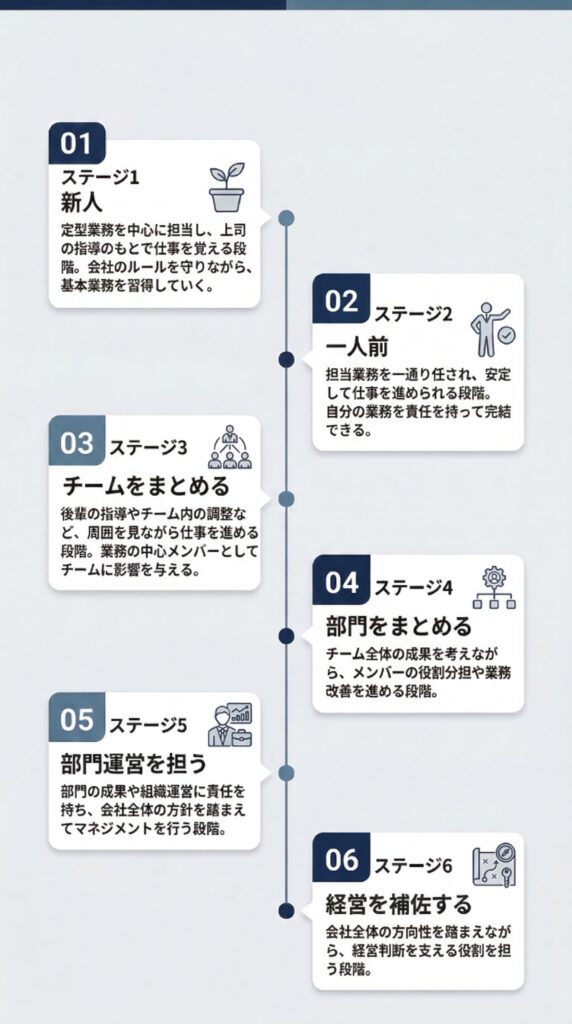 多くの会社では、社員の成長段階にはある程度共通した流れがあります。