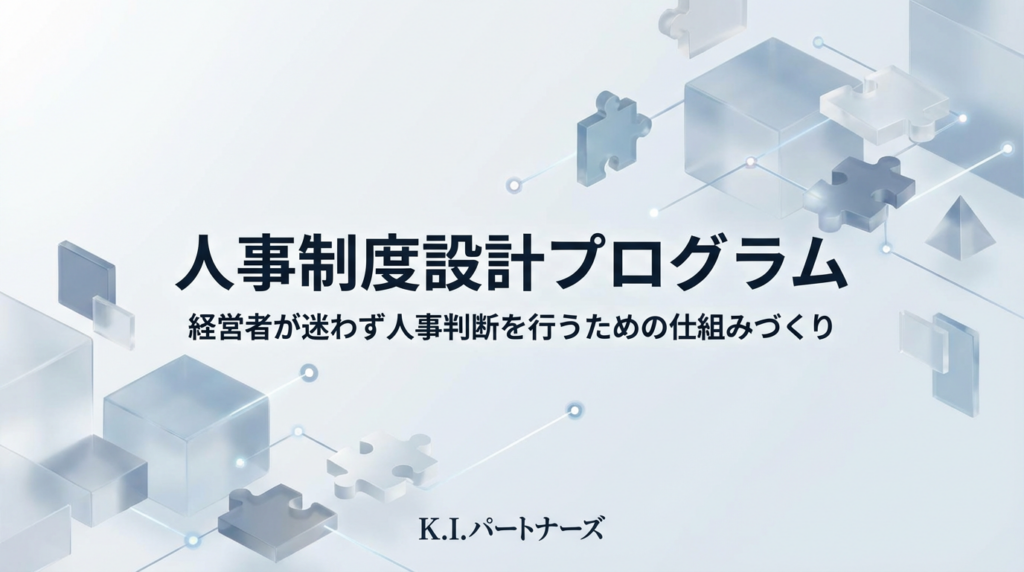 K.I.パートナーズでは、給与・評価・等級・面談を分断せずに整理し、経営者が人事の判断を迷わず行える状態をつくることを目的に、人事制度全体を一体で設計します。